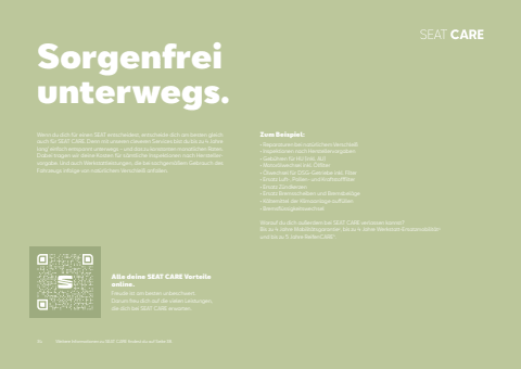 34 Weitere Informationen zu SEAT CARE findest du auf Seite 38.Sorgenfrei unterwegs.Wenn du dich f%u00fcr einen SEAT entscheidest, entscheide dich am besten gleich auch f%u00fcr SEAT CARE. Denn mit unseren cleveren Services bist du bis zu 4 Jahre lang1 einfach entspannt unterwegs %u2013 und das zu konstanten monatlichen Raten. Dabei tragen wir deine Kosten f%u00fcr s%u00e4mtliche Inspektionen nach Herstellervorgabe. Und auch Werkstattleistungen, die bei sachgem%u00e4%u00dfem Gebrauch des Fahrzeugs infolge von nat%u00fcrlichem Verschlei%u00df anfallen. Zum Beispiel:%u2022 Reparaturen bei nat%u00fcrlichem Verschlei%u00df%u2022 Inspektionen nach Herstellervorgaben%u2022 Geb%u00fchren f%u00fcr HU (inkl. AU)%u2022 Motor%u00f6lwechsel inkl. %u00d6lfilter%u2022 %u00d6lwechsel f%u00fcr DSG-Getriebe inkl. Filter%u2022 Ersatz Luft-, Pollen- und Kraftstofffilter%u2022 Ersatz Z%u00fcndkerzen%u2022 Ersatz Bremsscheiben und Bremsbel%u00e4ge%u2022 K%u00e4ltemittel der Klimaanlage auff%u00fcllen%u2022 Bremsfl%u00fcssigkeitswechsel Worauf du dich au%u00dferdem bei SEAT CARE verlassen kannst?Bis zu 4 Jahre Mobilit%u00e4tsgarantie2, bis zu 4 Jahre Werkstatt-Ersatzmobilit%u00e4t3und bis zu 5 Jahre ReifenCARE4.Alle deine SEAT CARE Vorteile online.Freude ist am besten unbeschwert. Darum freu dich auf die vielen Leistungen, die dich bei SEAT CARE erwarten.