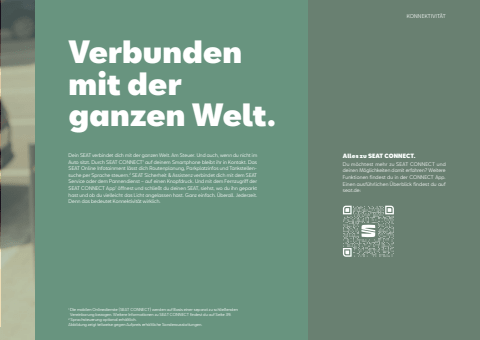 Dein SEAT verbindet dich mit der ganzen Welt. Am Steuer. Und auch, wenn du nicht im Auto sitzt. Durch SEAT CONNECT1 auf deinem Smartphone bleibt ihr in Kontakt. Das SEAT Online Infotainment l%u00e4sst dich Routenplanung, Parkplatzinfos und Tankstellensuche per Sprache steuern.2 SEAT Sicherheit & Assistenz verbindet dich mit dem SEAT Service oder dem Pannendienst %u2013 auf einen Knopfdruck. Und mit dem Fernzugriff der SEAT CONNECT App1 %u00f6ffnest und schlie%u00dft du deinen SEAT, siehst, wo du ihn geparkthast und ob du vielleicht das Licht angelassen hast. Ganz einfach. %u00dcberall. Jederzeit.Denn das bedeutet Konnektivit%u00e4t wirklich.KONNEKTIVIT%u00c4T1Die mobilen Onlinedienste (SEAT CONNECT) werden auf Basis einer separat zu schlie%u00dfenden Vereinbarung bezogen. Weitere Informationen zu SEAT CONNECT findest du auf Seite 39.2 Sprachsteuerung optional erh%u00e4ltlich.Abbildung zeigt teilweise gegen Aufpreis erh%u00e4ltliche Sonderausstattungen.Alles zu SEAT CONNECT.Du m%u00f6chtest mehr zu SEAT CONNECT unddeinen M%u00f6glichkeiten damit erfahren? Weitere Funktionen findest du in der CONNECT App. Einen ausf%u00fchrlichen %u00dcberblick findest du aufseat.de:Verbunden mit der ganzen Welt.
