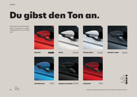 30 Abbildungen zeigen teilweise gegen Aufpreis erh%u00e4ltliche Sonderausstattungen.FARBENNichts geht %u00fcber einen l%u00e4ssigen Auftritt. Am besten in deiner Lieblingsfarbe. Na, wie klingt das?!Du gibst den Ton an.PURE ROT1 FR XC St R WEISS1 FR XC St RSAPPHIRE BLAU2 FR XC StNEVADA WEISS2 FR XC St RMIDNIGHT SCHWARZ2 FR XC St RMAGNETIC GRAU2 FR XC St RDESIRE ROT3 FR XC St1Soft2Metallic3ExclusiveSerieOptionalReference RStyle StXcellence XCFR FR